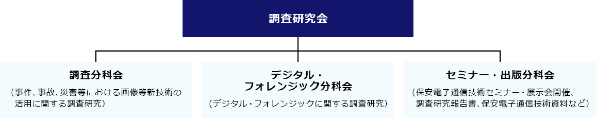 保安通信協会では、調査研究を進めるにあたり、「調査研究部会」を設置し、さらにその下に調査研究テーマごとに「分科会」を設けて、各種のITサービスや技術、製品等に関する情報、さらには国民生活の安心、安全の向上に役立つソリューションに関するアイデアを、展示会等を通じて提供し、関係機関の業務の効率化や高度化の推進を図るものです。